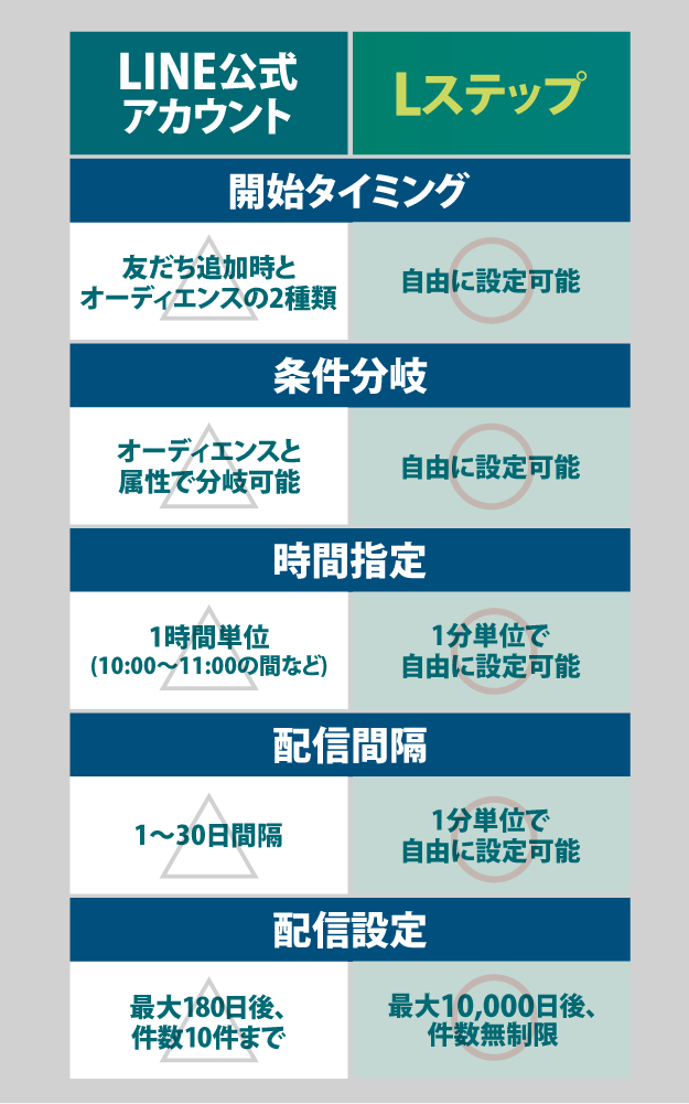 一方でLステップのシナリオ配信なら、最短で友だち追加直後から、1分単位で、設定できるメッセージはスタートからゴールまで無制限となっています。