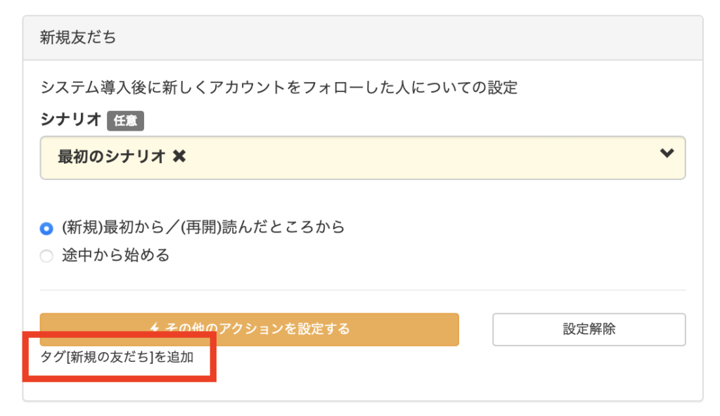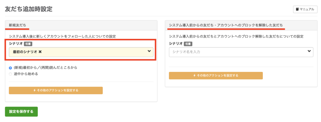 左の「新規友だち」の「シナリオ」に、あいさつメッセージを1通目に設定した作成したシナリオを選択します。