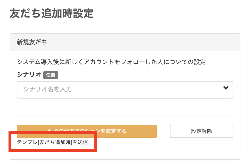 シナリオは設定せず、テンプレートであいさつメッセージを送信する場合は、アクション設定で該当のテンプレートを選択します。