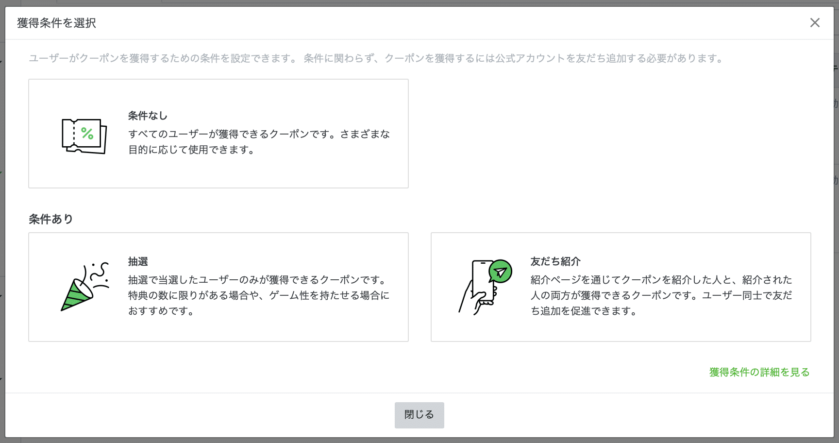 「条件なし」「抽選」「友だち紹介」から選択できます。