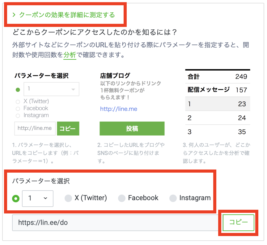 SNSごとに異なるクーポンURLを発行し、どこから何件アクセスがあったかを見える化できます。