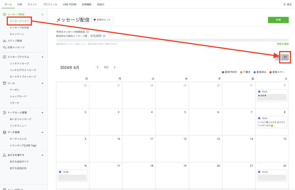 配信した日時は「メッセージリスト」からカレンダー表示で確認できます。ぱっと見でわかりやすいので、配信タイミングの参考に活用しましょう。