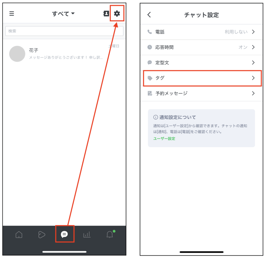 画面中央下のチャットマーク>設定>タグの順に進みます。