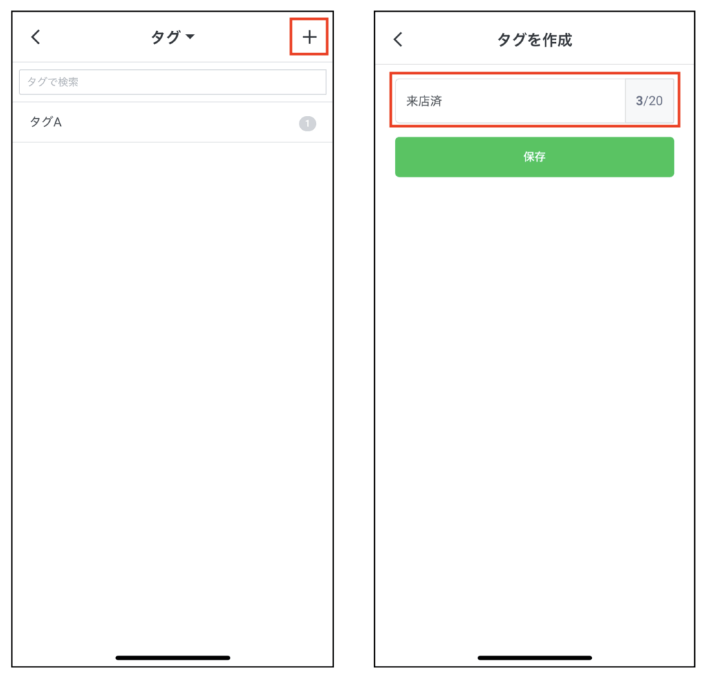 「+」ボタンをタップすると、タグの作成画面に進みます。20文字以内で入力し、保存しましょう。