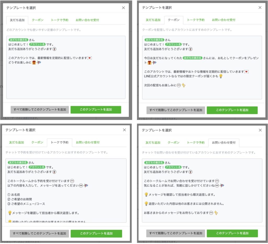 クーポンやリッチメッセージは、あらかじめ作成したものをアップする必要があるため、未作成の場合は作成してから、あいさつメッセージの編集を行う必要があります。