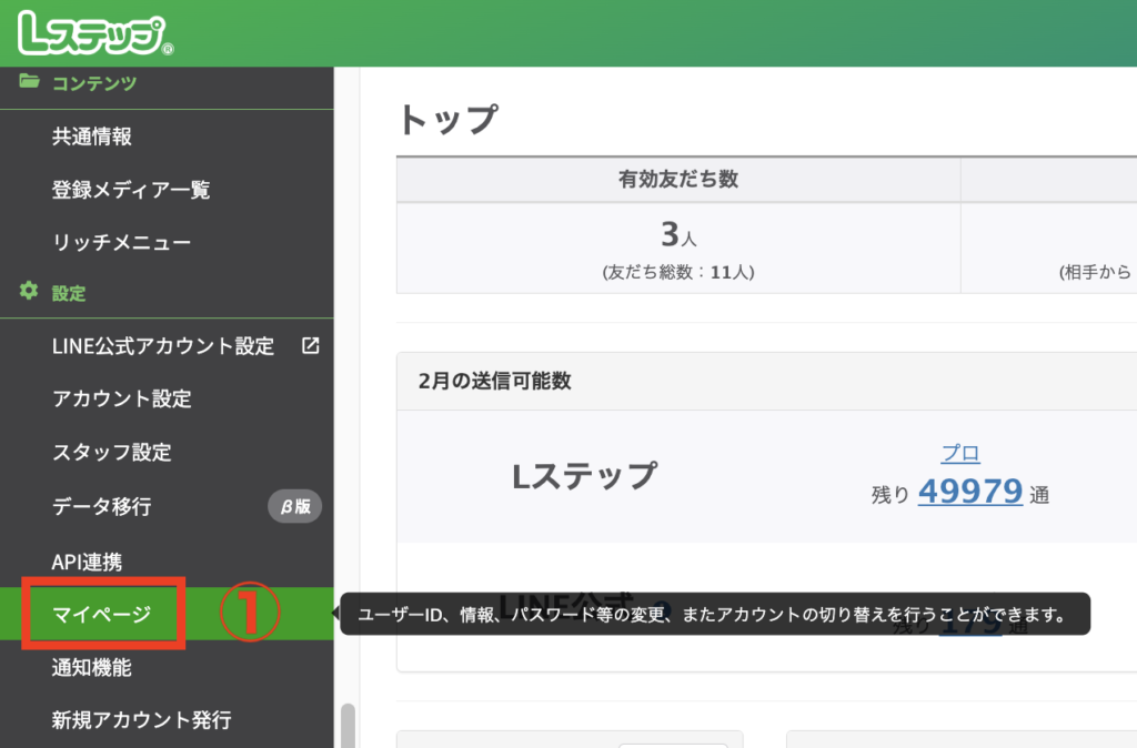 ①パソコンからLステップの管理画面にログインし、「マイページ」をクリックします。