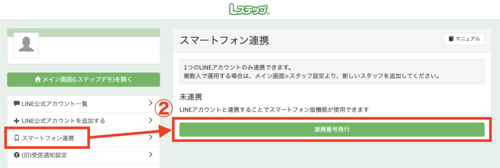 ②「スマートフォン連携」>「連携番号発行」をクリックします。