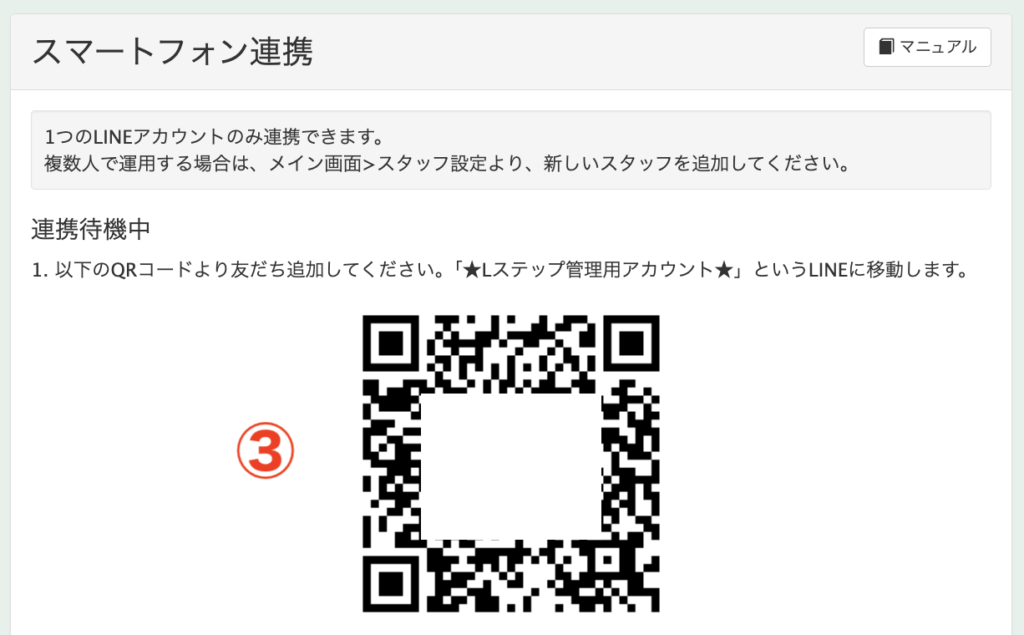 ③表示されたQRコードを読み取ると、「★Lステップ管理用アカウント★」というLINE公式アカウントが表示されるので、友だち追加します。