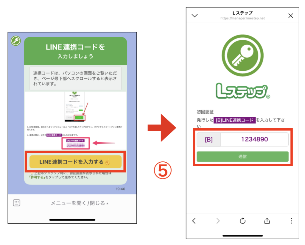 ⑤「LINE連携コードを入力する」をタップし、④で表示された「LINE連携コード」を入力して、送信をタップします。