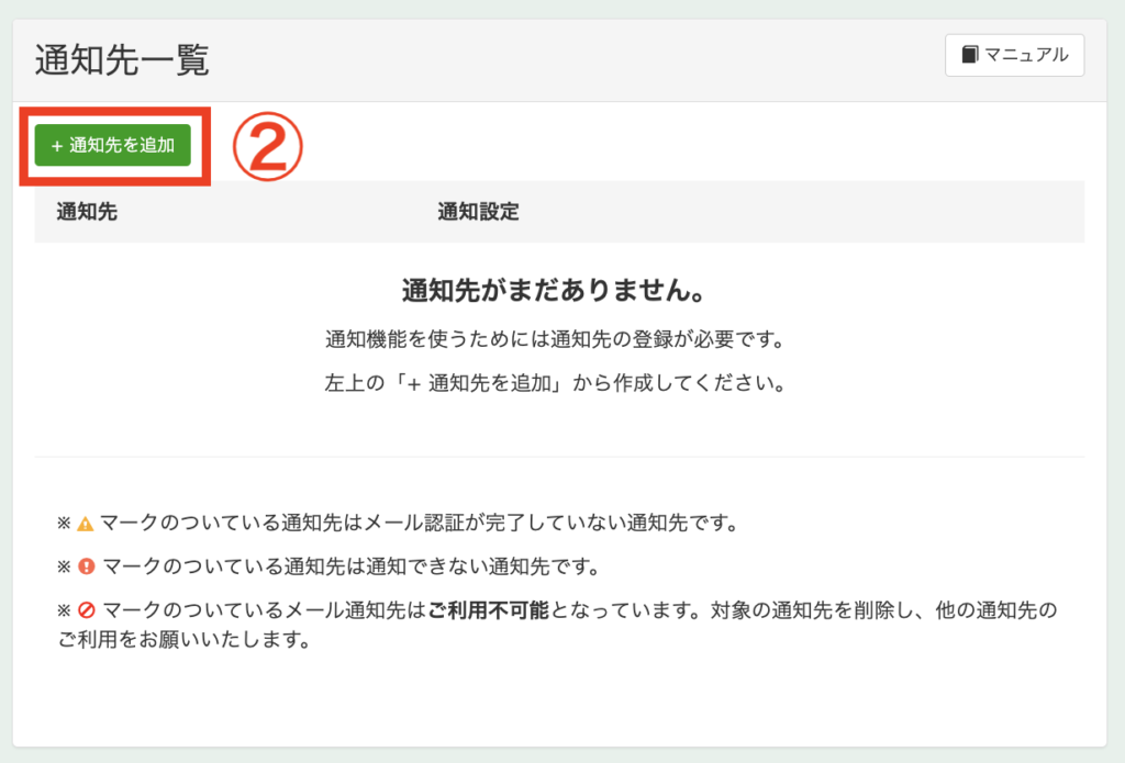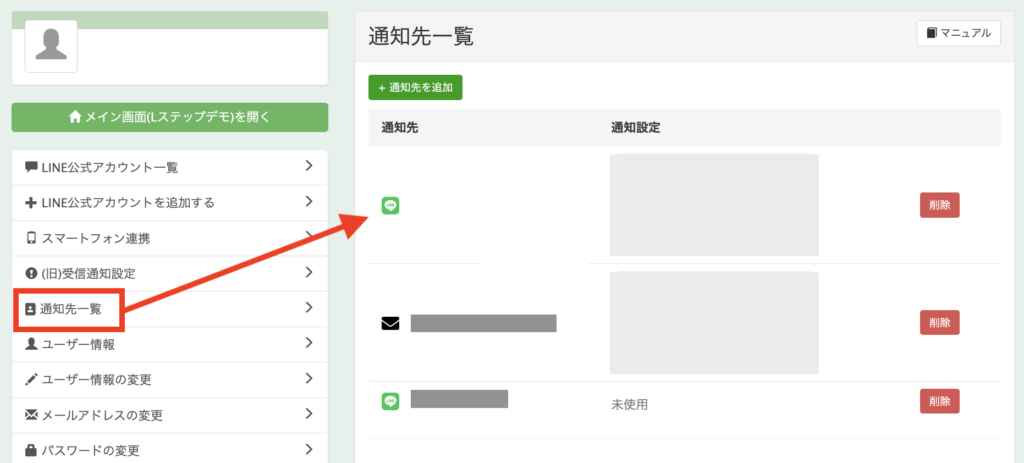 登録した通知先は、Lステップの管理画面>マイページ>通知先一覧から確認できます。