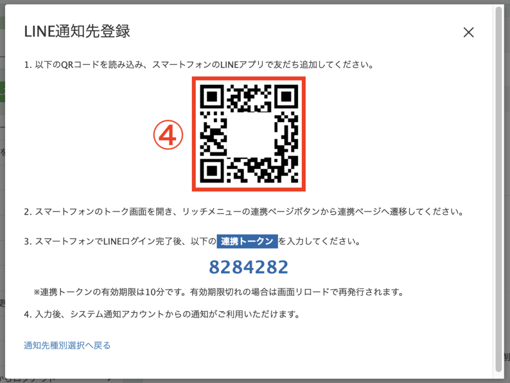 LINE連携コードの有効期限は10分です。以下のように期限が切れていると表示された場合は、④のページを更新し、新たなLINE連携コードを取得してください。