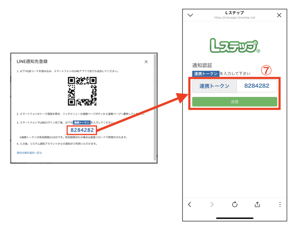 ⑦通知認証画面が開くので、Lステップ管理画面側の設定で取得した「連携トークン」を入力し【送信】ボタンをタップします。