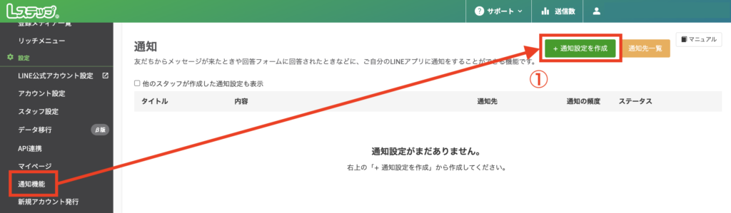 ①Lステップの管理画面>「通知機能」>「+通知設定を作成」をクリックします。
