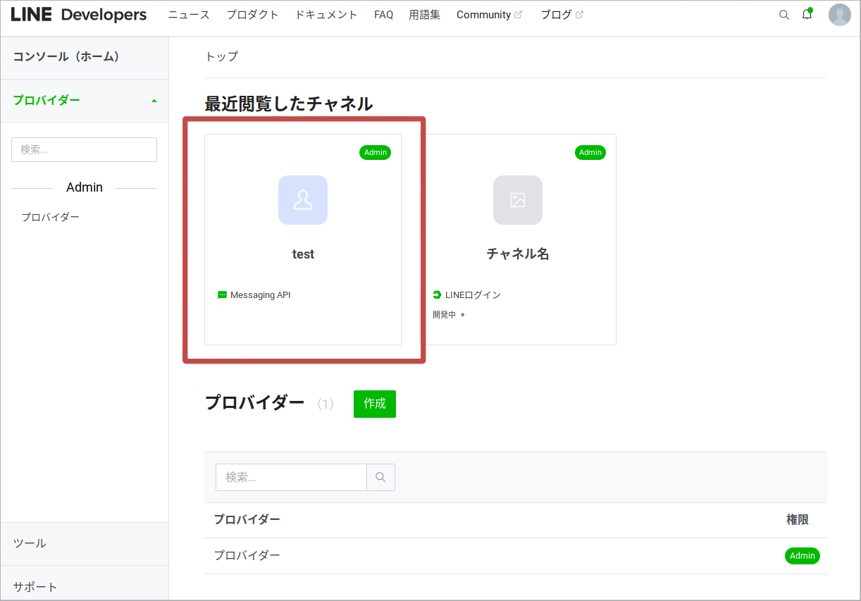 LINE Developersコンソールにログインし、プロバイダーから対象のチャネルを選択
