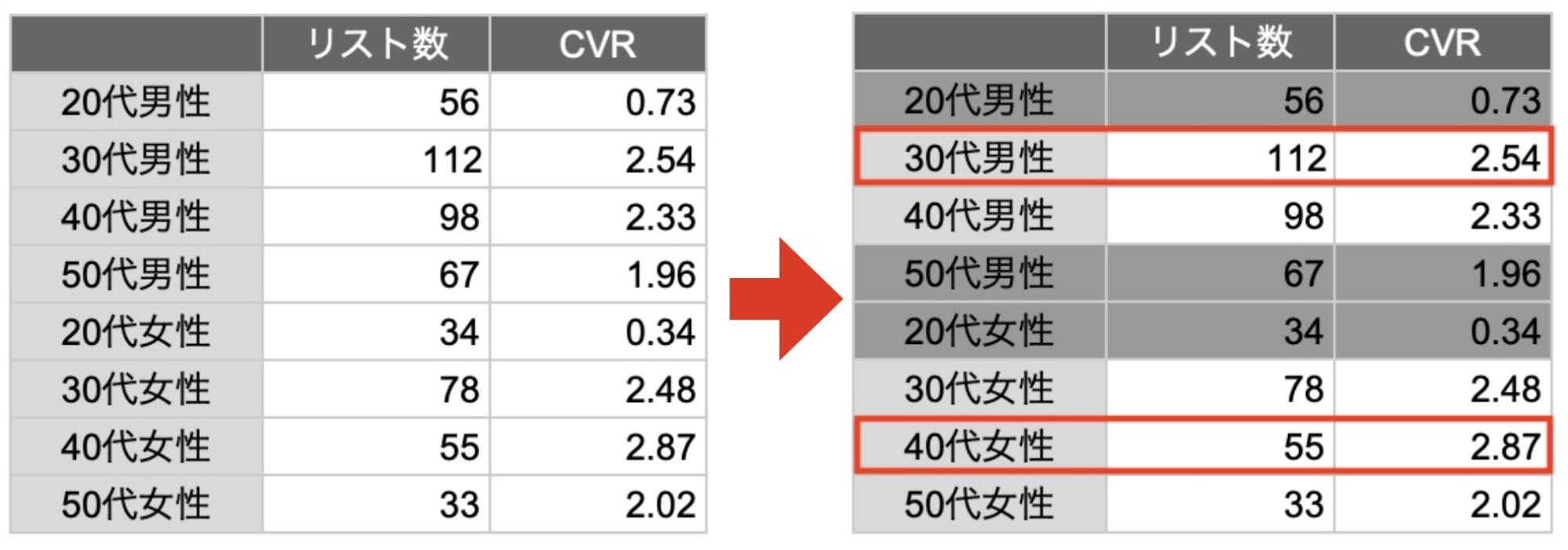 そこで、30代男性と40代女性のセールスを強化し、CVRの低い20代男女と50代男性のアプローチを停止しました。
