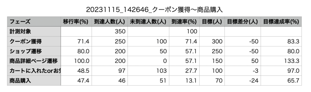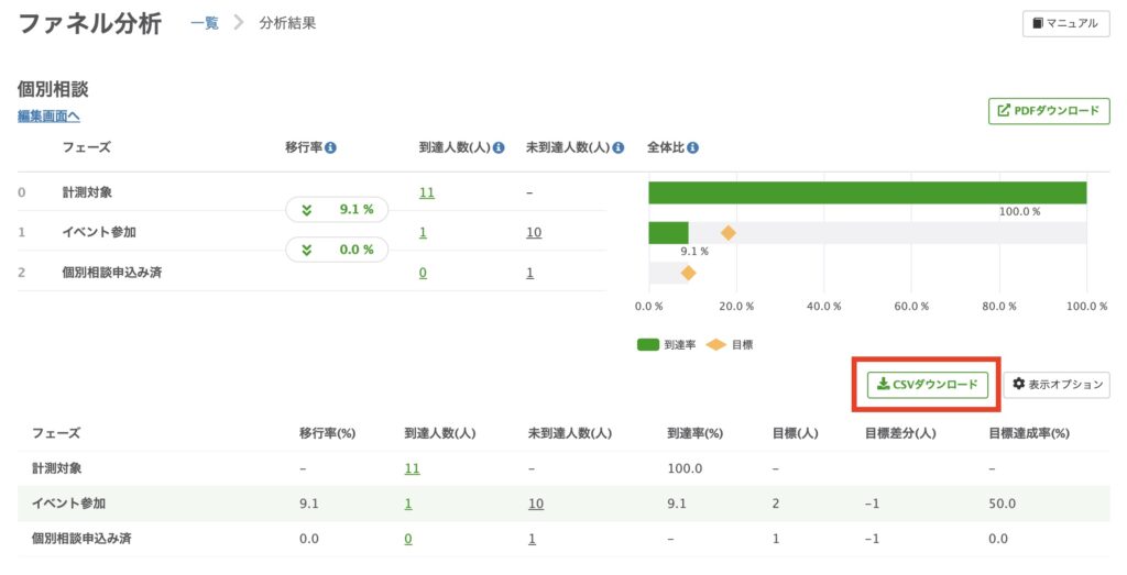 ファネル分析の分析数値は、CSVとしてダウンロードできます。