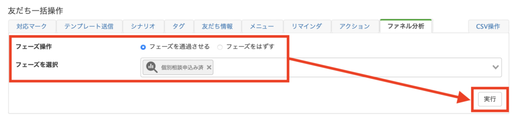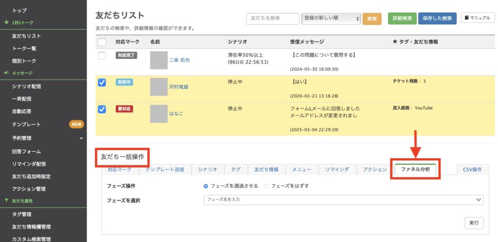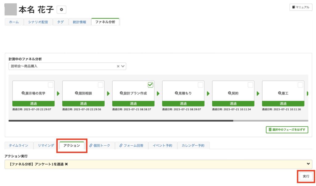 個別にフェーズを追加させたい場合は、【友だち詳細画面】>【アクション】から実行したいファネル分析のアクションを選択し、【実行】をクリックします。