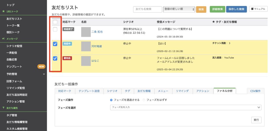 あらかじめフェーズを操作するアクション管理を作成しておき、友だちリストから選択して一括で実行できます。