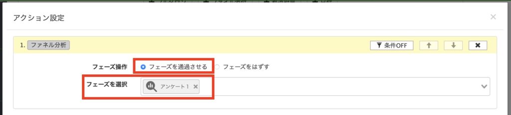 ②「フェーズを通過させる」を選択して、作成したフェーズを指定し、保存します。