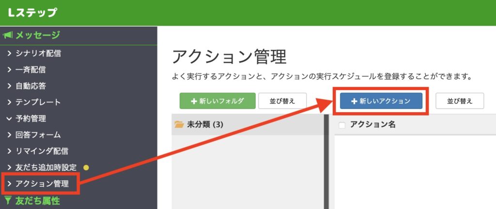 ①【アクション管理】>【+新しいアクション】をクリックします。