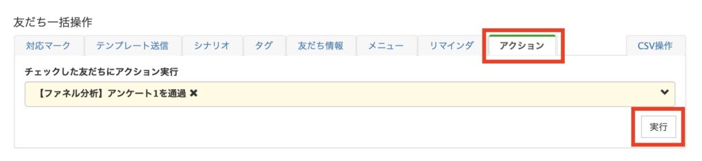 ③友だちリストから対象の友だちを選択し、【友だち一括操作】>【アクション】で、先ほど作成したアクションを選択します。実行をクリックして完了です。