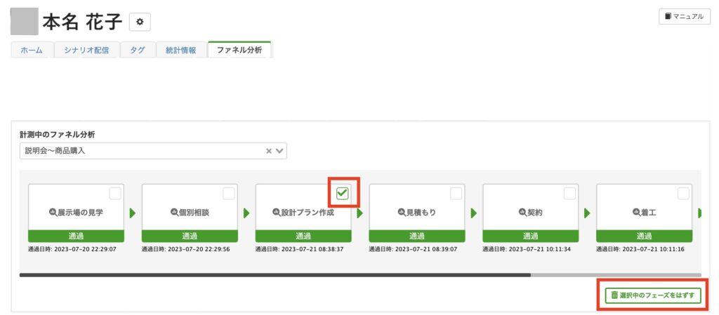 個別にフェーズを外したい場合、【友だち詳細画面】>【ファネル分析】から外したいフェーズを選択し、【選択中のフェーズをはずす】から外せます。