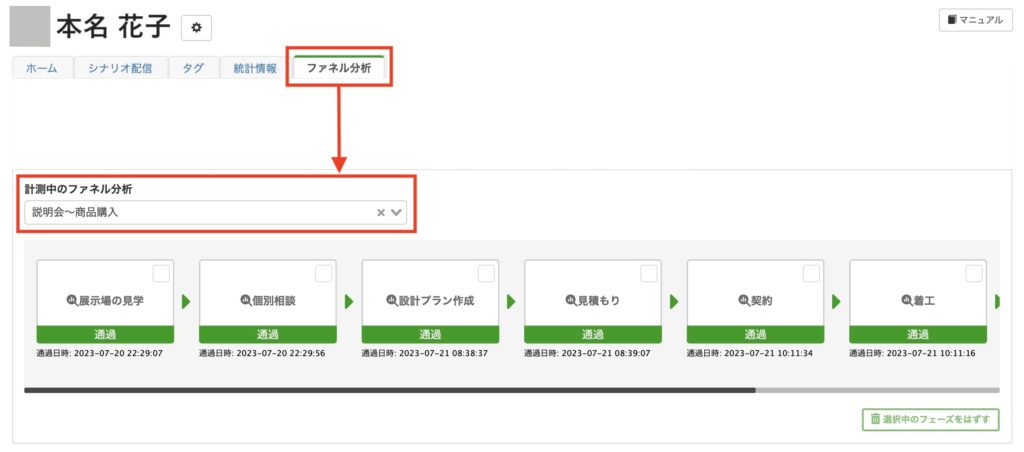 友だち個人詳細画面では、通過したとみなされたフェーズには「みなし通過」と表示されます。