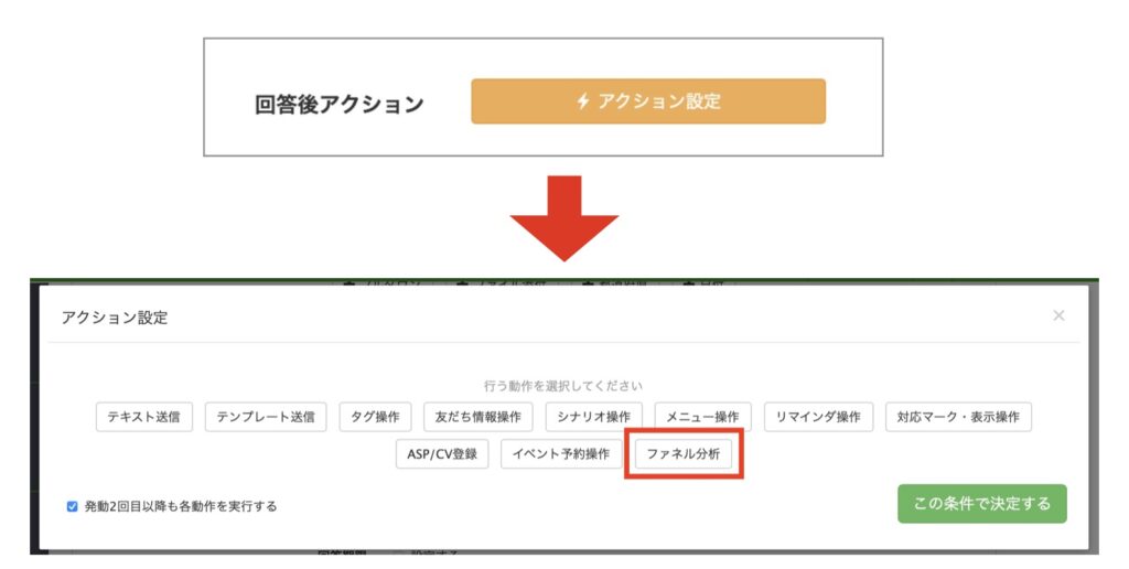 ①回答フォームの回答後アクション【アクション設定】>【ファネル分析】をクリックします。