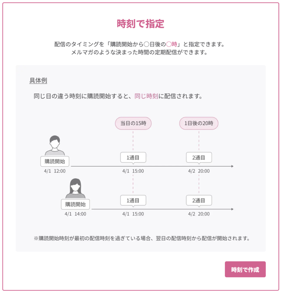 ユーザーによって開始のタイミングが変わるケースでは、いつ開始のタイミングを迎えても指定の時刻に送られる「時刻で指定」を使う方が、無難と言えるわけです。