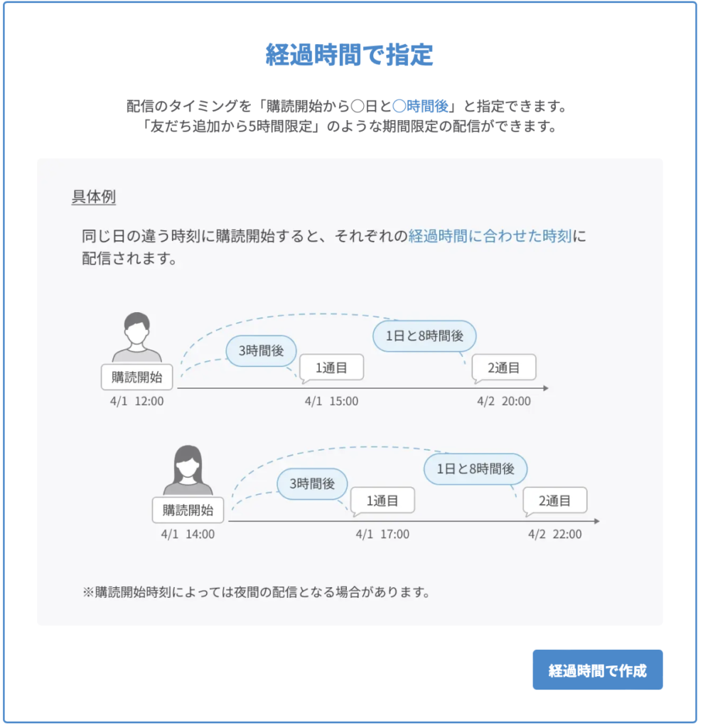 「経過時間で指定」は上図のように、開始タイミングによって送られる時間が異なるため、丸1日近く配信が遅れる心配はありません。