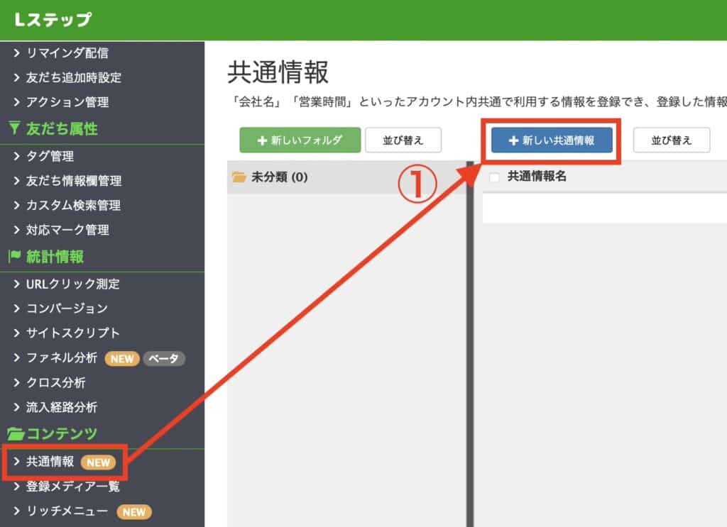 ①Lステップ管理画面左メニューの「共通情報」>「+新しい共通情報」をクリックします。