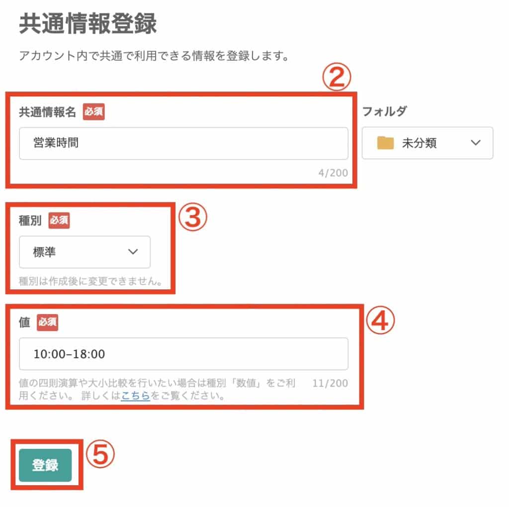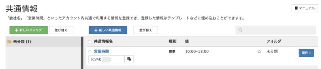 共通情報とは、アカウント内で共通で利用できる情報を登録できる機能です。