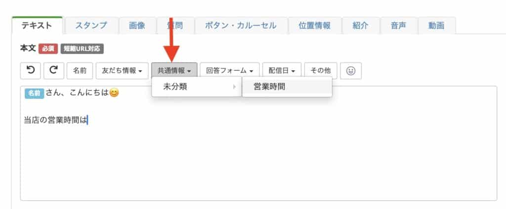 一方、共通情報とは、全ての友だちに対して同じように送信したい情報を保存し、運用者側が差し込みたい文言をメッセージ内にフォーマットで埋め込めます。