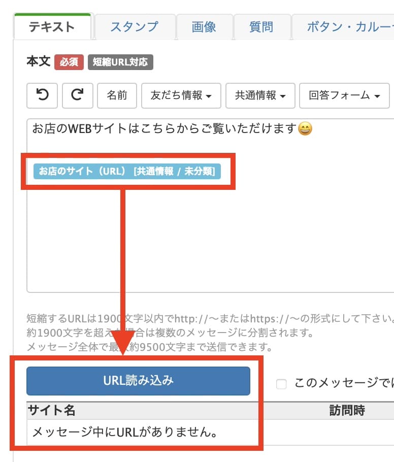 共通情報で登録したURLは、メッセージの「URL設定」ができません。
