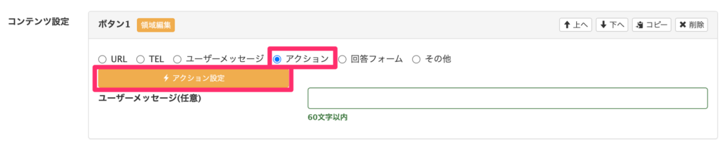 1. リッチメニュータップ時などのアクション設定で、メッセージの配信設定をします。