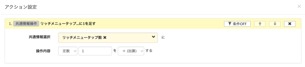 4.  事前に作成した共通情報「リッチメニュータップ数」を選択します。操作内容で定数「1」を「+(加算)する」にします。