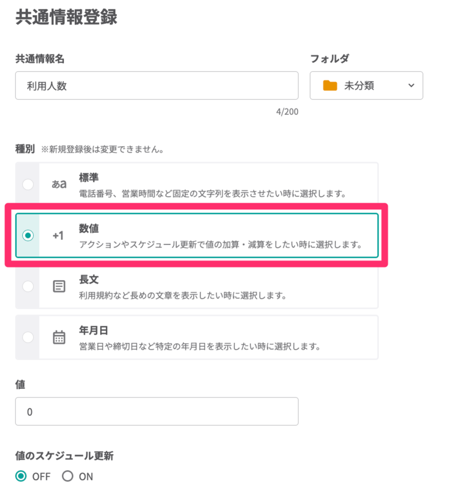 「駐車台数」「滞在人数」などのように、数値計算を行う可能性のある情報を登録する場合は、あらかじめ種別「数値」を選択して作成してください。