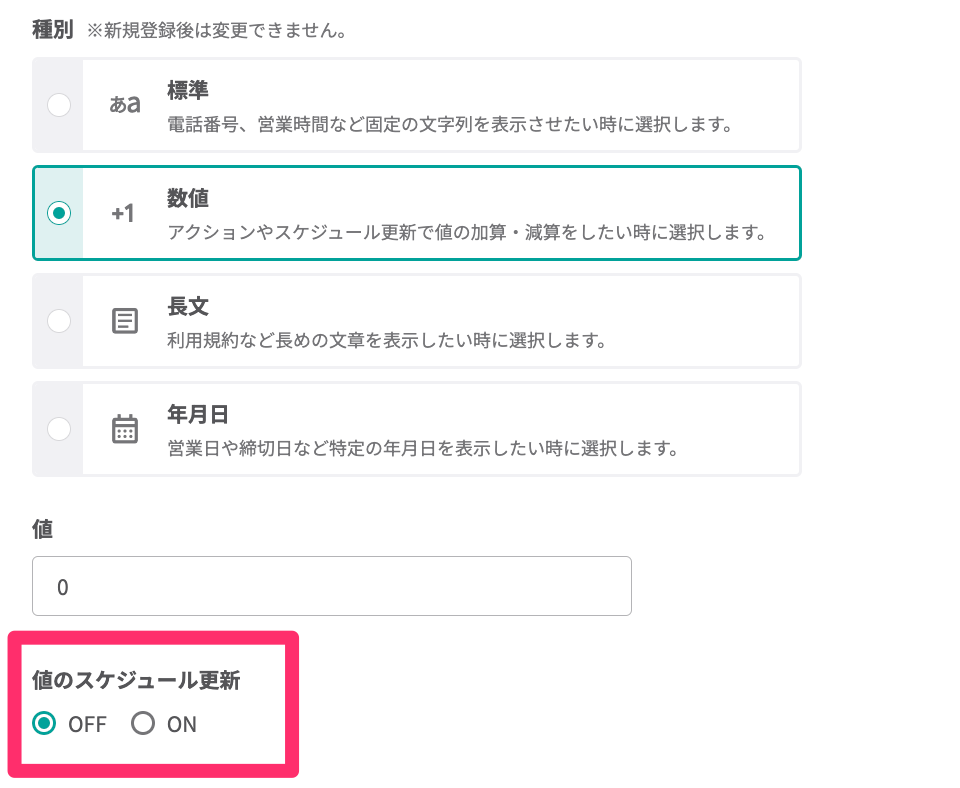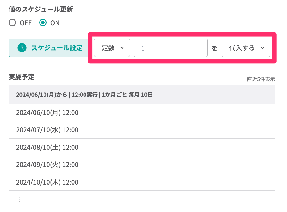 「値のスケジュール更新」をONにすると、指定したスケジュールで共通情報の値を更新できます。