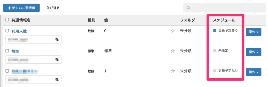 ※種別「数値」以外の共通情報や、スケジュール更新がOFFの場合は「未設定」、更新が終了した共通情報は「更新予定なし」と表示されます。