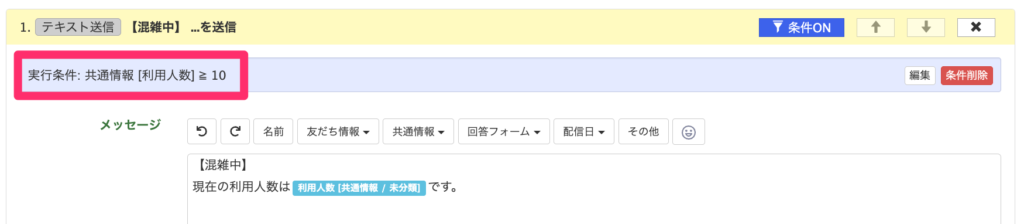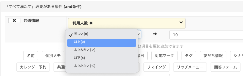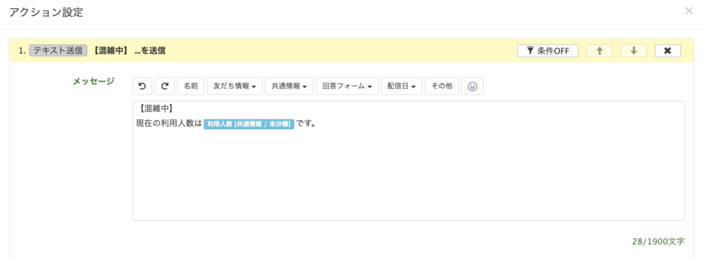 例えば、施設の滞在人数を条件に指定して、友だちに送信するメッセージを出し分ける設定ができます。