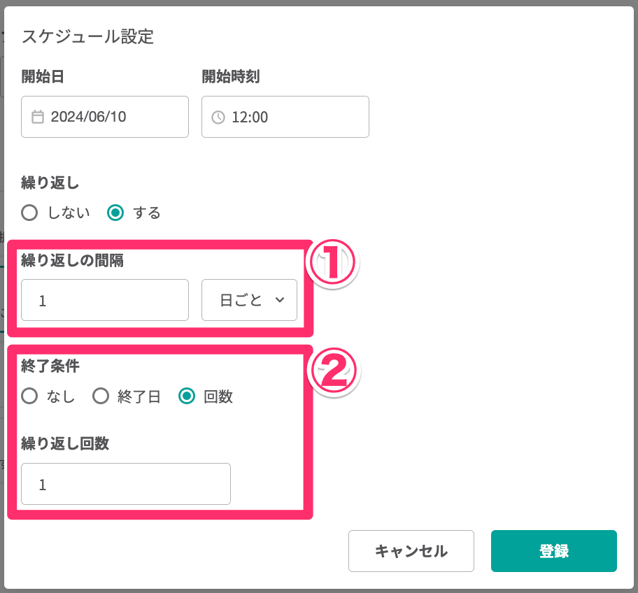 2. スケジュール設定画面で「開始日」と「開始時刻」を入力します。【繰り返し】で「する」を選択すると、繰り返す間隔と終了条件を設定できます。