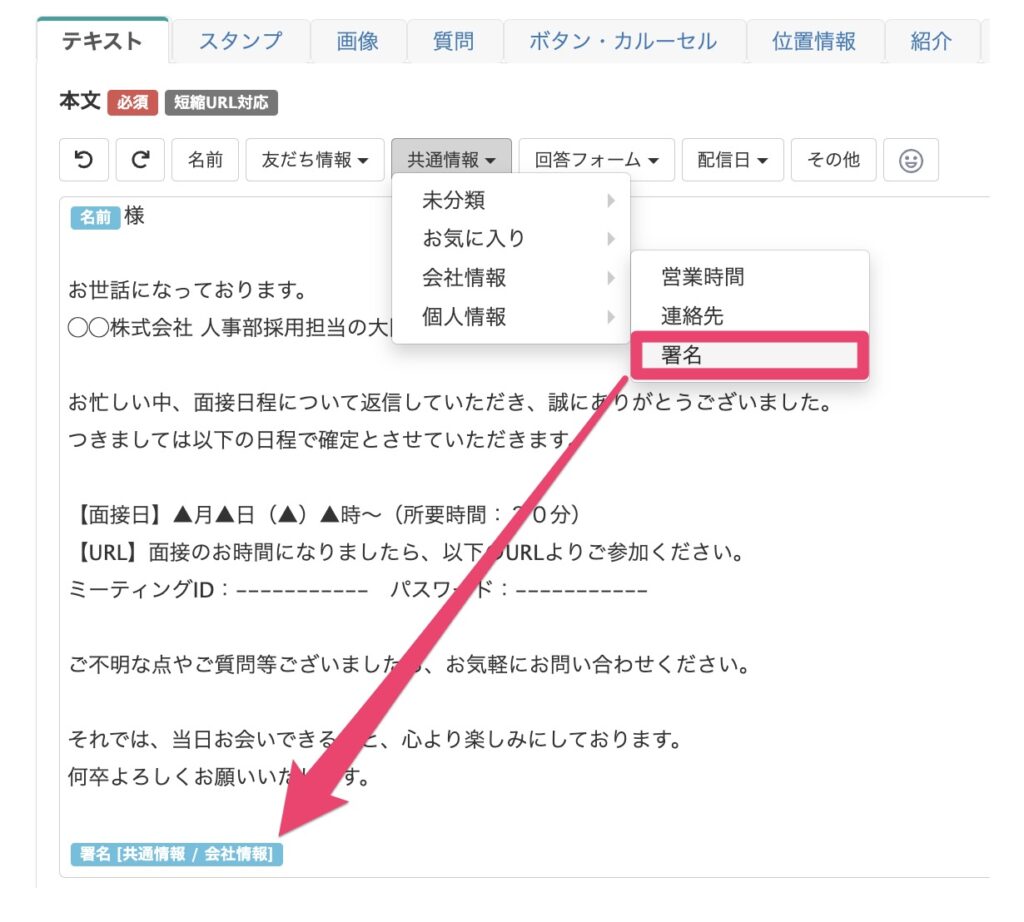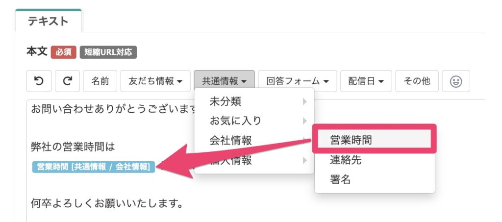 作成した共通情報は、テンプレートやアクションのテキスト送信で、置き換えタグから選択し、設置できます。