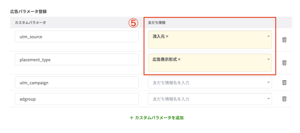 ⑤「広告パラメータ登録」で、友だち追加時に取得したいカスタムパラメータを設定します。カスタムパラメータごとに、登録したい友だち情報欄を選択してください。