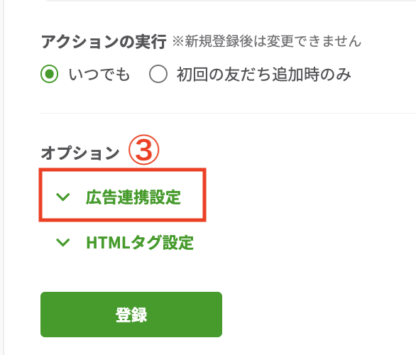 ③オプションの「広告連携設定」をクリックします。