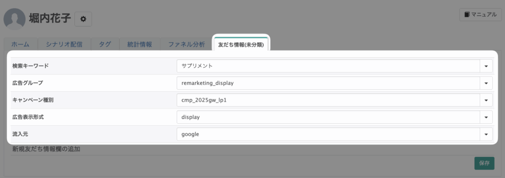 設定した流入経路で友だち追加されると、該当の友だちの友だち情報欄にパラメータの値が登録されます。