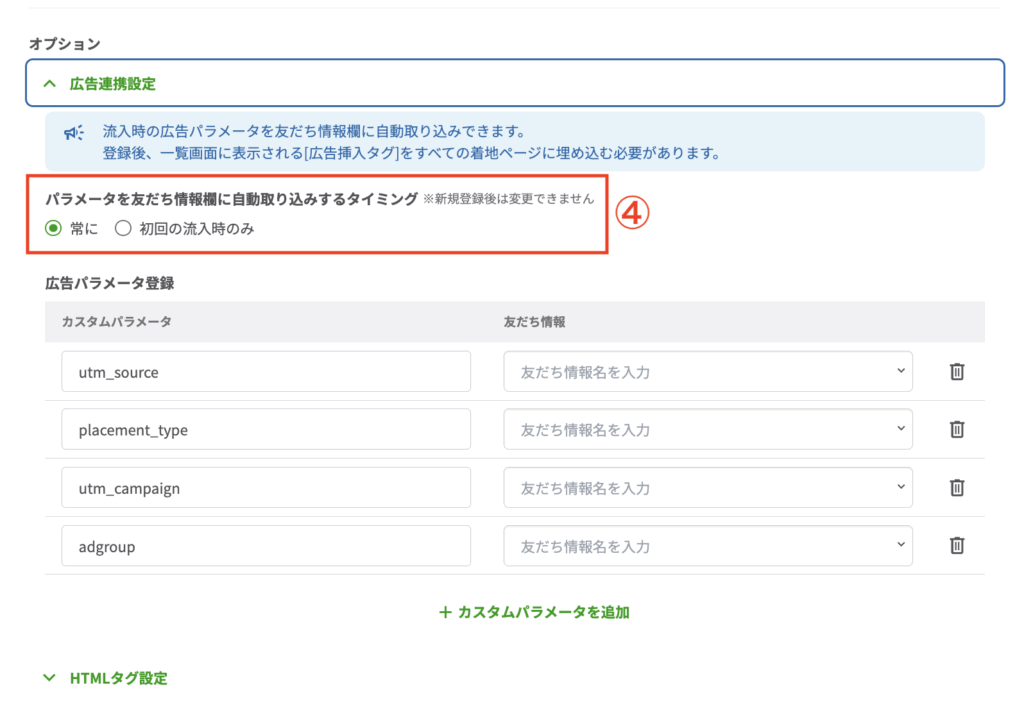 ④オプション > 「パラメータを友だち情報欄に自動取り込みするタイミング」を選択します。