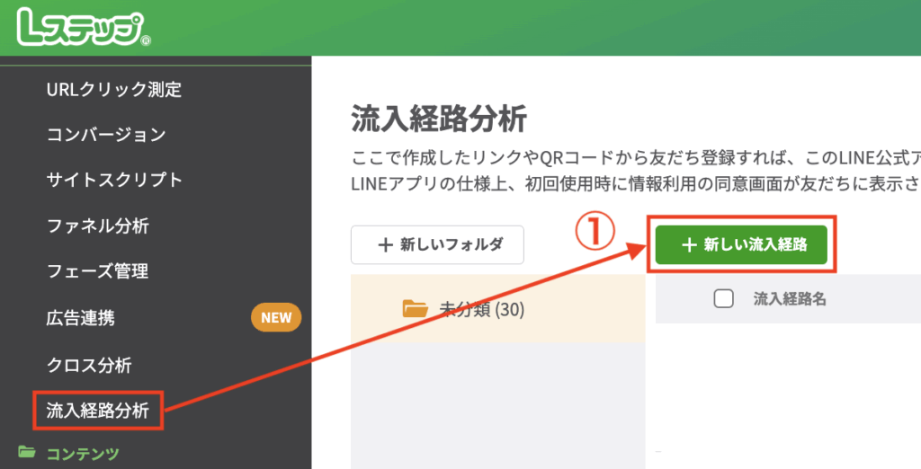 1. Lステップ管理画面左メニューから「流入経路分析」>「+新しい流入経路」をクリックします。