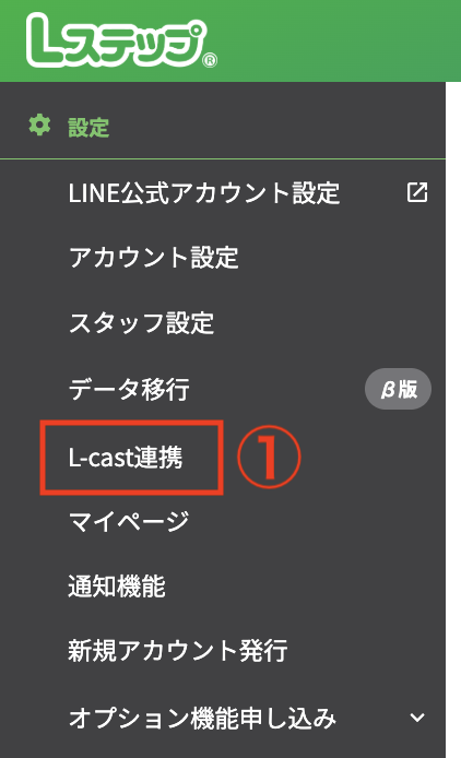①Lステップ管理画面の左メニューから「L-cast連携」をクリックします。