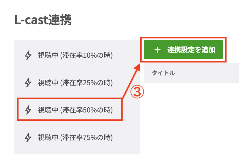 ③今回はウェビナーに50%滞在した時にタグを付けます。「視聴中(滞在率50%の時)」をクリックして「+連携設定を追加」をクリックします。