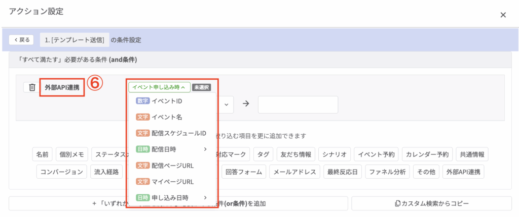 ⑥今回はイベント内の特定の配信スケジュールを指定してみましょう。右上の「条件OFF」をクリックし、「API連携」をクリックします。